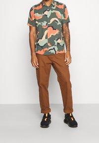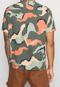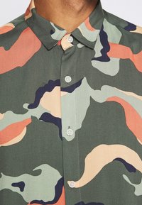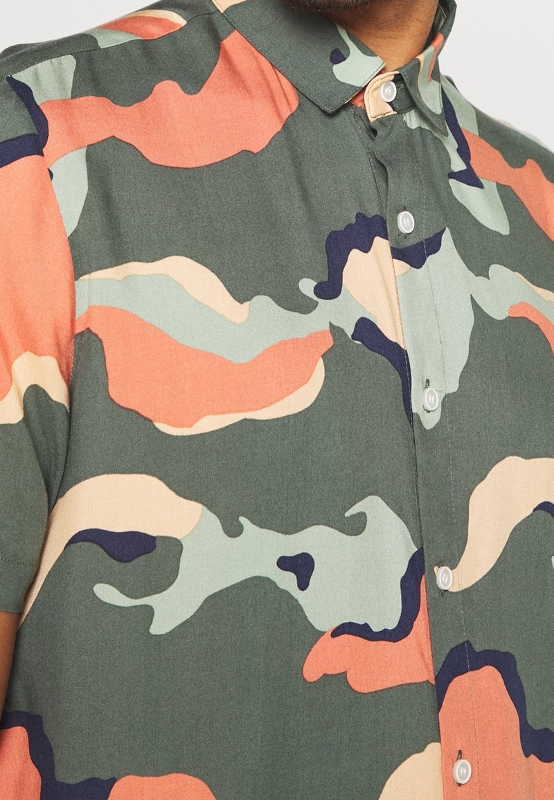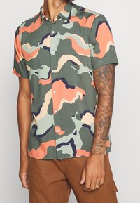 Homme portant une chemise à manches courtes boutonnée avec un motif abstrait camouflage vert, corail, beige et marine.