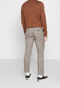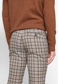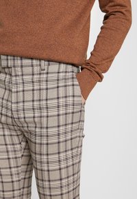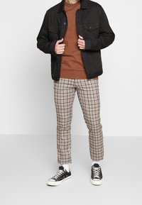 Pull marron associé à un pantalon à carreaux beige, marron et noir, avec une coupe ajustée et des ourlets retroussés, complété par des baskets noires.