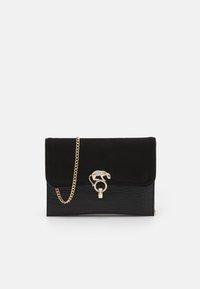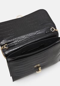 Pochette en similicuir noir avec texture crocodile, dotée d'une fermeture à rabat, d'une bandoulière chaîne et d'accents à pampilles.