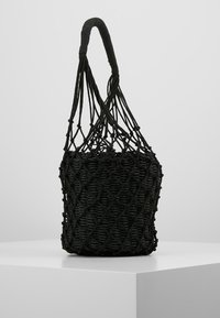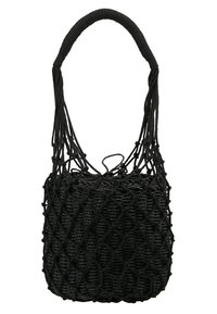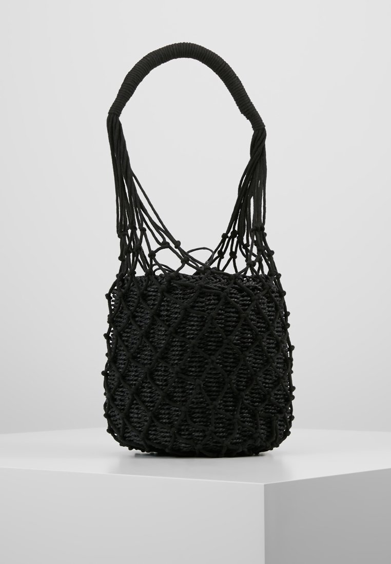 Sac en bucket noir tissé avec un extérieur en filet et une poignée épaisse et enroulée, exposé sur un piédestal blanc contre un fond gris.