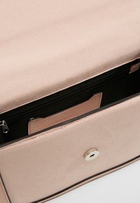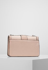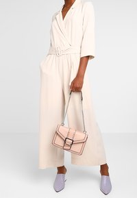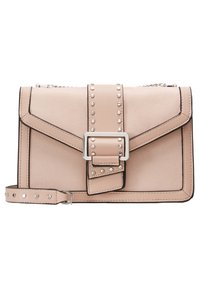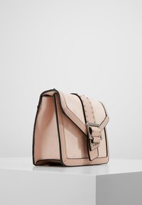 Sac bandoulière rectangulaire rose clair avec des clous argentés, une grande boucle centrale et une sangle amovible posée sur une surface blanche.