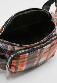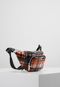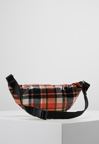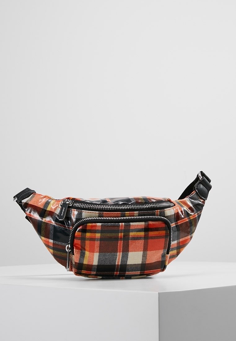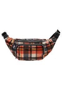 Sac banane à carreaux en orange, noir et blanc avec une finition brillante ; il comporte une poche zip à l'avant et une bandoulière ajustable pour un port sécurisé.