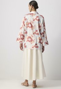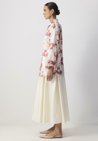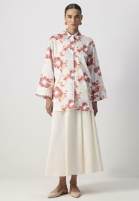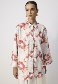 Femme portant une chemise ample à manches longues boutonnée, avec des motifs floraux tie-dye rouges, beiges et bleus, et des boucles d'oreilles pendantes dorées, sur fond blanc.