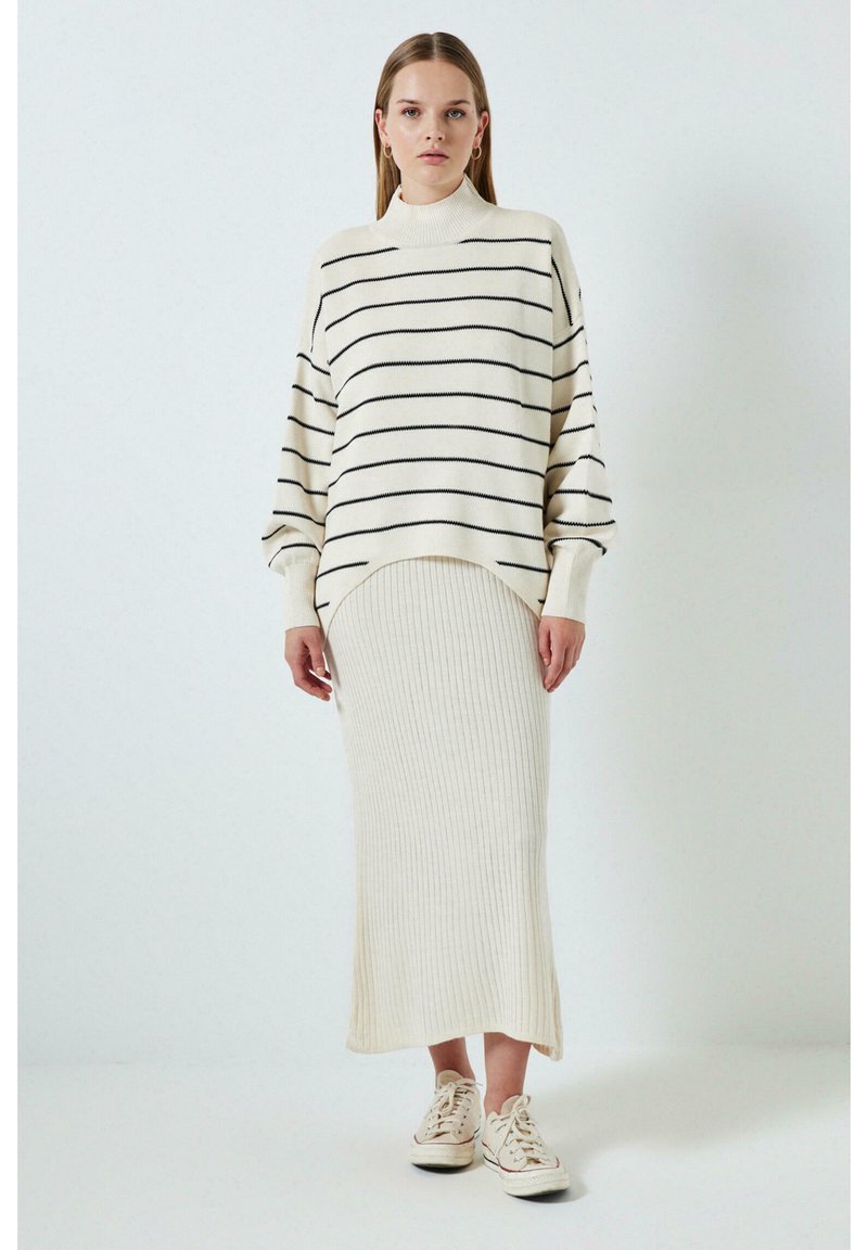 Femme portant une jupe midi blanche côtelée, un pull blanc oversize avec des rayures horizontales noires, et des baskets blanches, debout devant un fond uni.