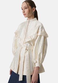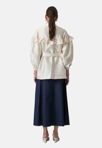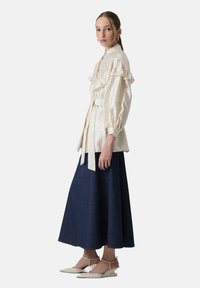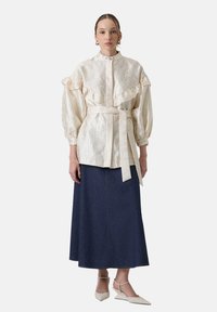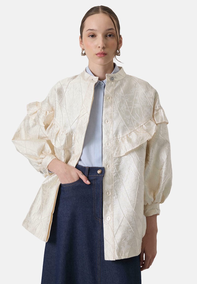 Jeune femme portant une veste texturée écrue à volants sur une chemise bleu clair et une jupe en denim foncé taille haute, posant avec une main dans la poche.