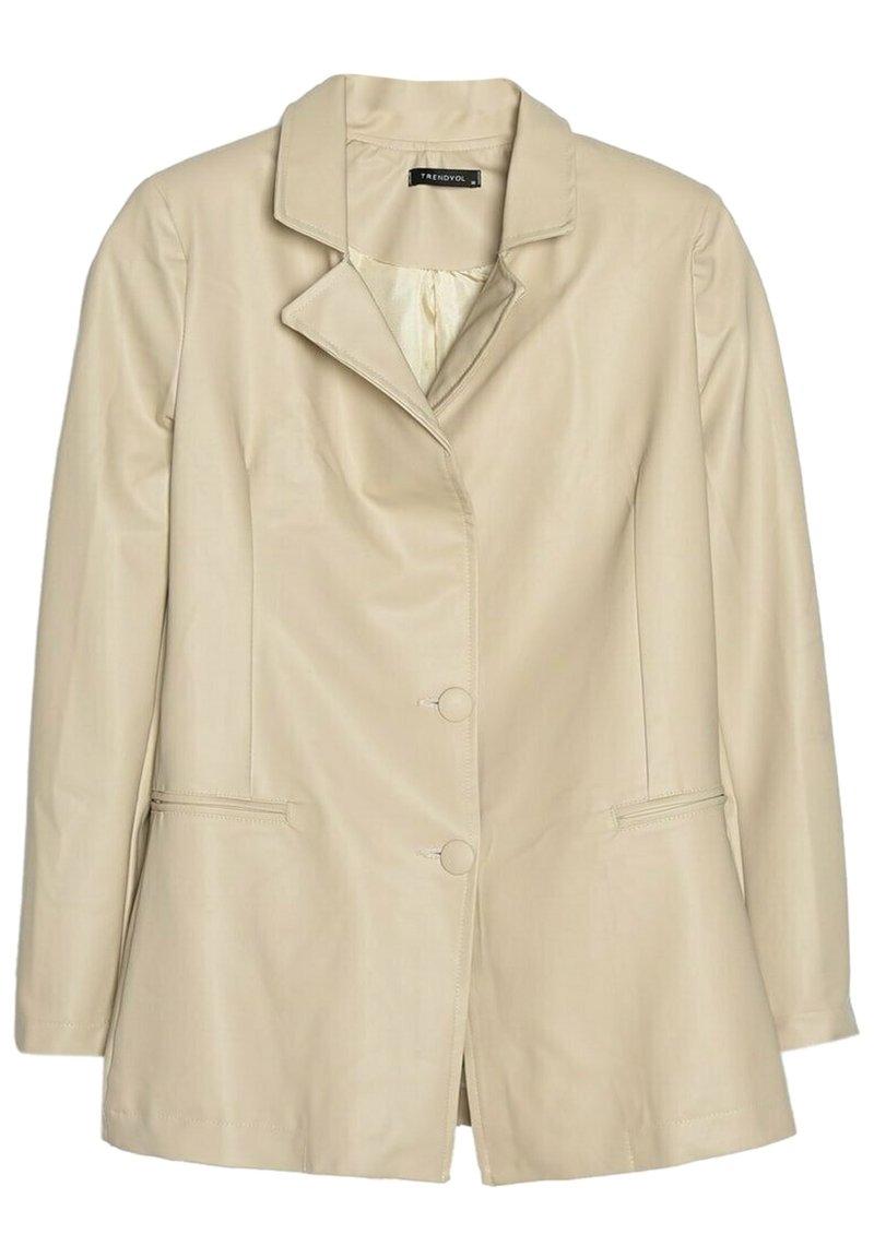 Blazer beige ajusté en tissu lisse, doté d'un col cranté, de deux poches avant et de deux boutons de fermeture.