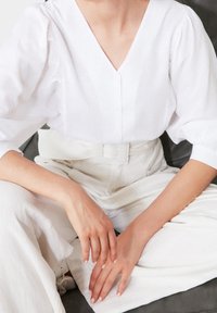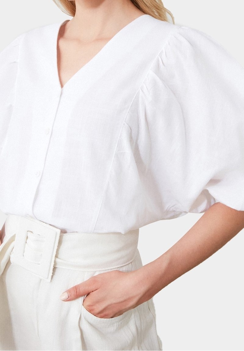 Femme portant un chemisier blanc à col en V avec des manches bouffantes et un pantalon blanc taille haute avec une large ceinture à boucle rectangulaire.