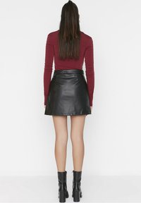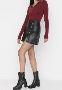 Femme portant un haut à manches longues froncé bordeaux, une mini-jupe en cuir noire avec fermeture éclair latérale, et des bottines noires, debout les jambes écartées.