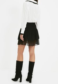 Chemise blanche boutonnée avec col à volants noirs, associée à une jupe noire à volants superposés et des bottes noires montant jusqu'aux genoux. Texture de tissu lisse.