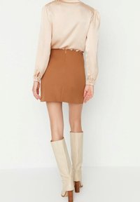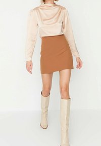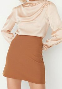 Blouse en satin beige avec col drapé et manches longues, associée à une mini-jupe marron cintrée. Texture lisse et détails de couture minimalistes.