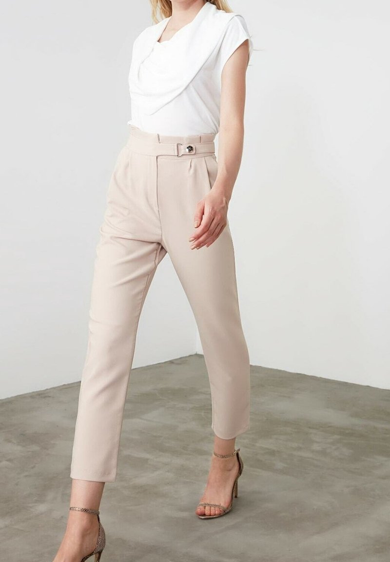 Haut blanc drapé associé à un pantalon beige taille haute avec une ceinture et une boucle argentée, complété par des sandales à talons transparents.