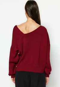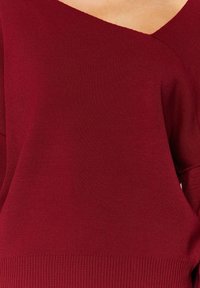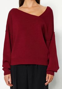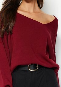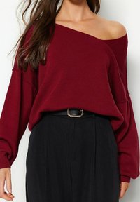 Femme portant un pull ample bordeaux avec un large col en V et des épaules tombantes associé à un pantalon noir, debout devant un fond blanc.