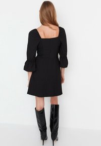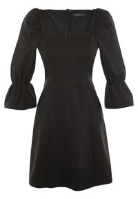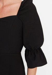 Robe noire avec un décolleté carré, des manches bouffantes et un corsage ajusté, s'évasant en une jupe courte en A. Tissu lisse sans motifs visibles.
