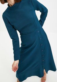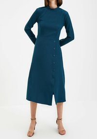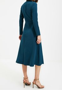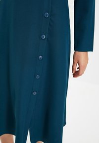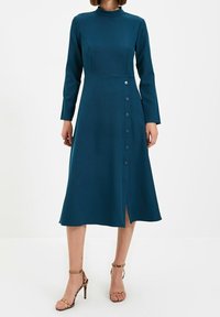 Robe longue à manches longues couleur sarcelle avec col montant, corsage ajusté, jupe évasée en forme de A et détails de boutons à l'avant ; texture lisse et longueur au genou.