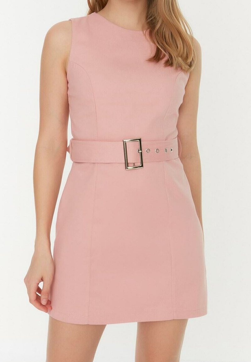 Robe rose sans manches avec une silhouette ajustée, une large ceinture dotée d'une boucle carrée en métal et des détails discrets de coutures le long du corsage.