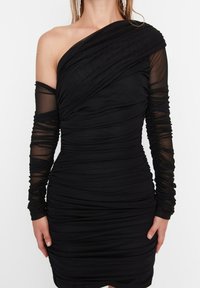 Robe mini noire à une épaule, avec un tissu plissé et de longues manches transparentes. Fabriquée en matière extensible avec une texture lisse.