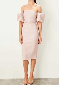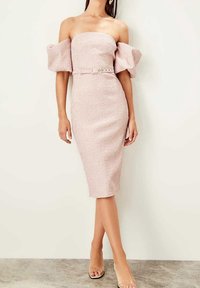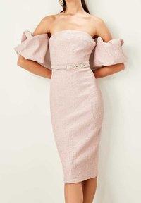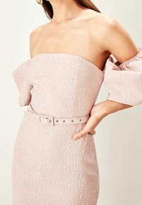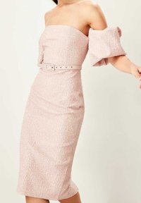 Robe rose ajustée en tissu texturé, design sans bretelles avec de grandes manches bouffantes. Comprend une ceinture assortie ornée de petits accents métalliques.