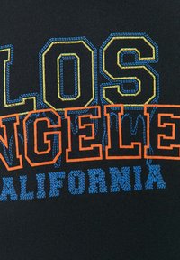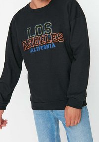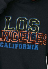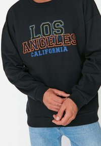 Personne portant un sweat-shirt noir avec le texte "Los Angeles California" en jaune, orange et bleu, associé à un jean bleu clair.