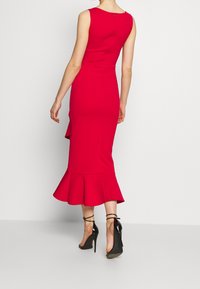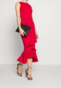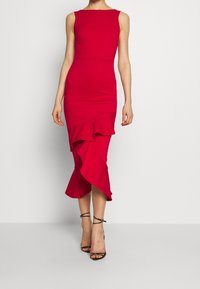 Robe rouge ajustée avec un décolleté en U et un ourlet asymétrique à volants. Fabriquée à partir d'un tissu extensible, accompagnée de sandales noires à talons hauts et à lanières.