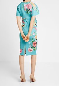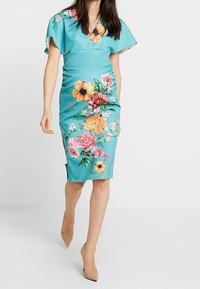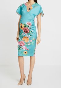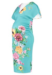 Une robe de maternité turquoise avec un décolleté en V profond, des manches volant et un imprimé floral en rose, orange et vert ; silhouette ajustée.