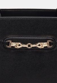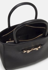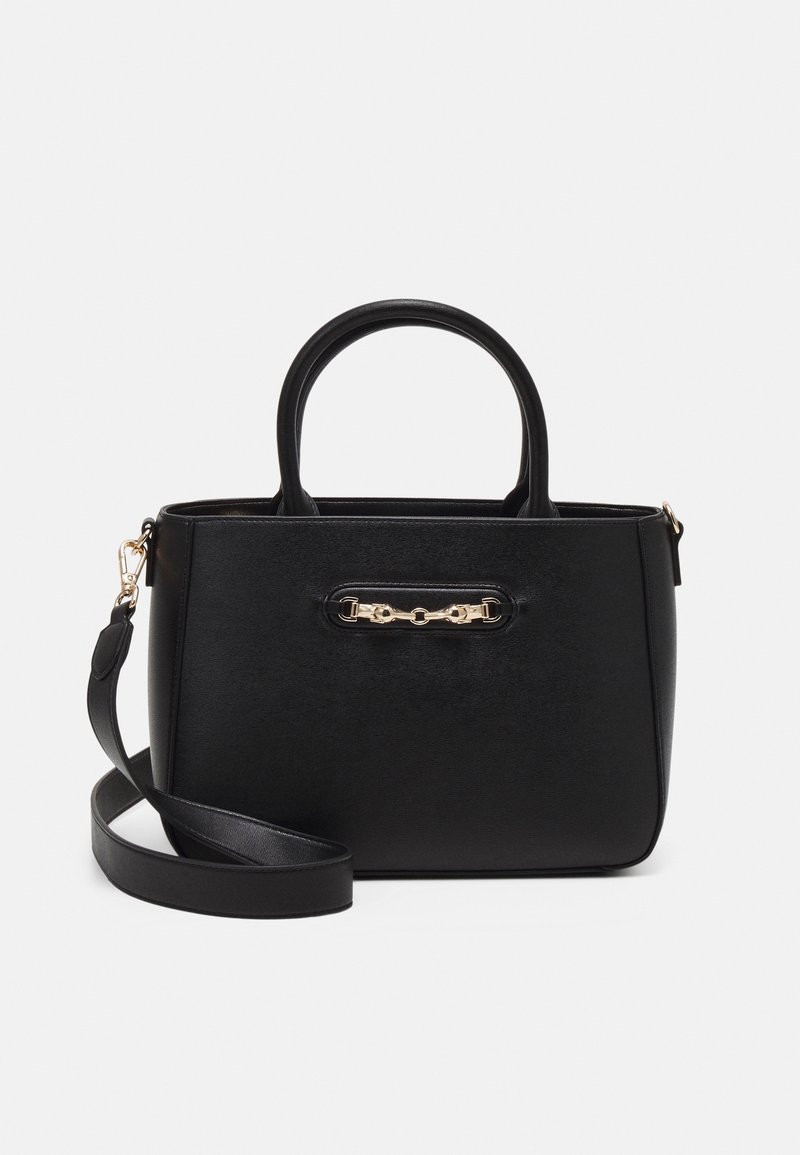 Sac à main en cuir noir avec deux poignées supérieures, une bandoulière amovible et un détail mors doré sur le devant.