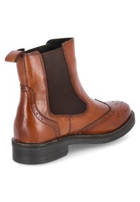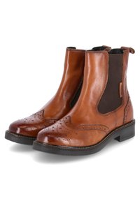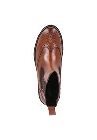 Bottine Chelsea en cuir marron avec détails brogués, empiècements élastiques sur les côtés et petit talon noir. Texture lisse et design classique.