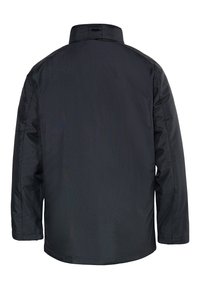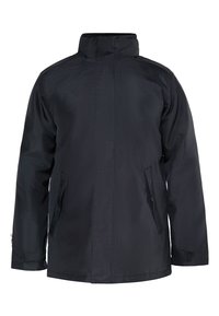 Veste imperméable noire avec capuche, en tissu lisse légèrement texturé et coupe décontractée, vue de dos.