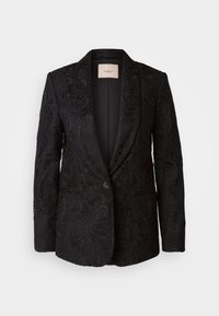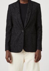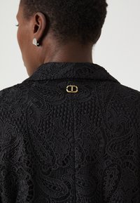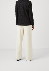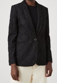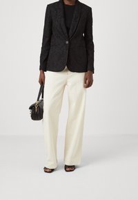 Blazer en dentelle noire avec des motifs floraux porté sur un top noir côtelé, associé à un pantalon taille haute blanc cassé.