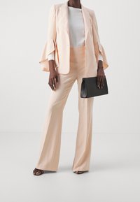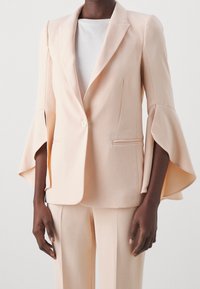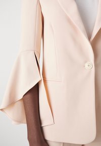 Blazer rose pâle avec manches évasées, fermeture à un bouton et deux poches avant. Porté sur un haut blanc et assorti à un pantalon sur mesure.