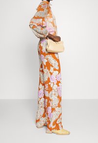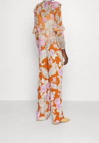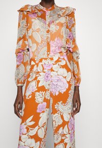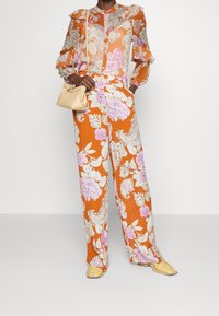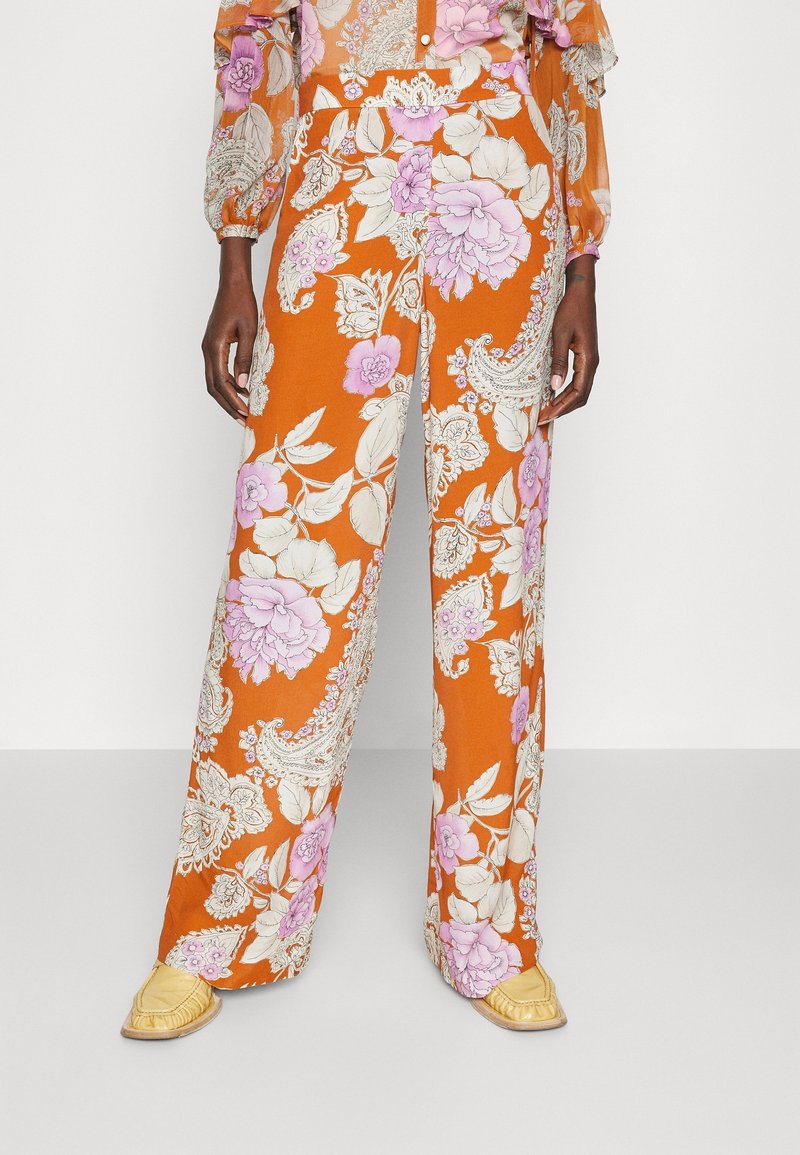 Pantalon large orange avec de grands motifs floraux crème et roses ainsi que des motifs paisley, porté avec des chaussures beiges à bout pointu.