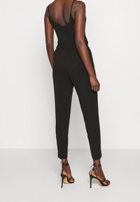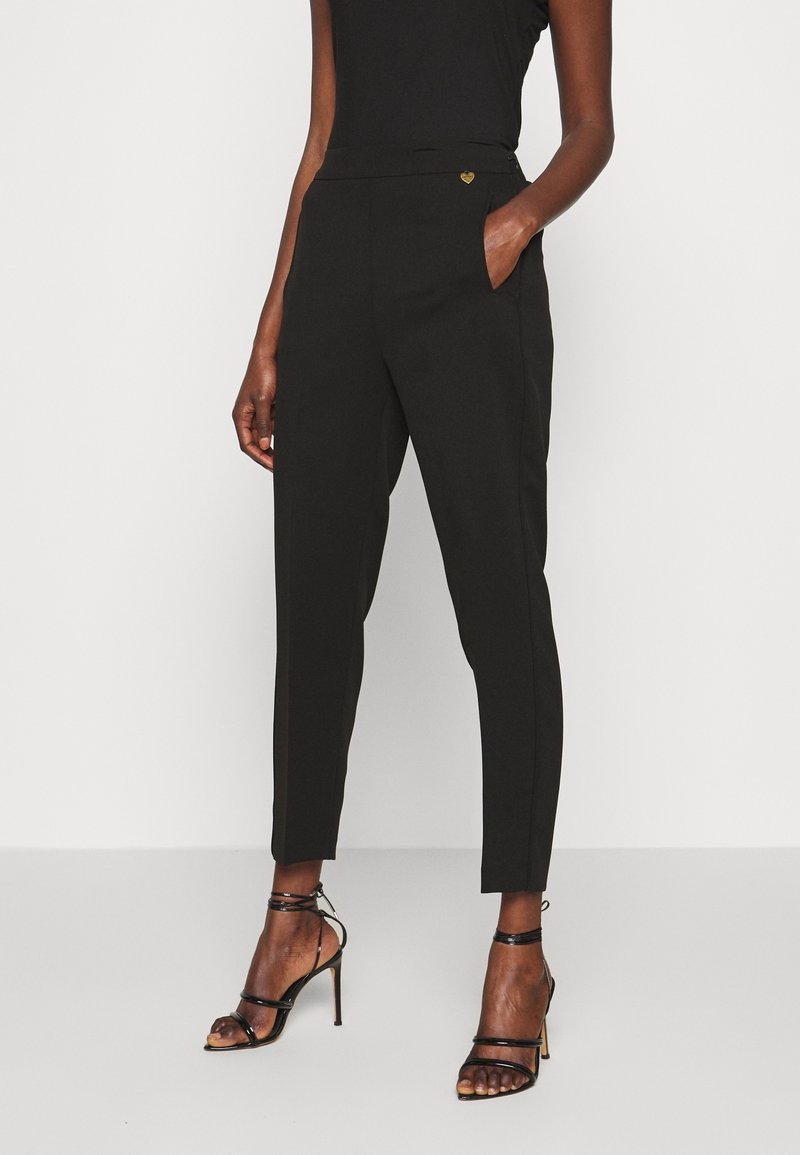 Femme portant un pantalon noir fuselé, un haut sans manches noir et des sandales noires à talons aiguilles avec des lanières, debout avec une main dans la poche.