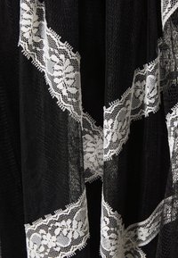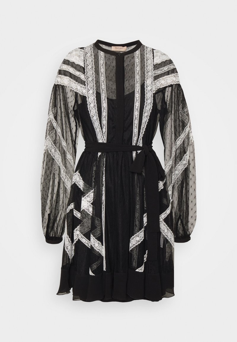 Robe noire en tissu transparent avec manches longues bouffantes, rayures verticales en dentelle blanche et ceinture nouée à la taille sur un fond uni.