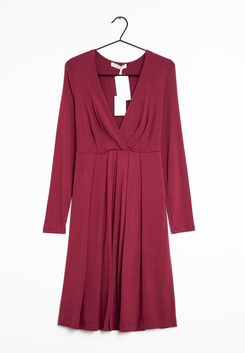 Robe bordeaux à manches longues avec un décolleté en V profond, jupe plissée et tissu doux. Comprend une étiquette suspendue au niveau du col.
