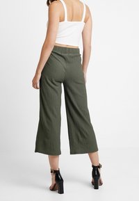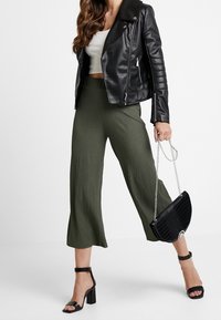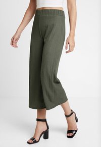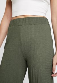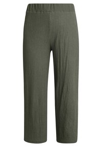 Pantalons larges en vert olive texturé avec une taille élastique, associés à des talons hauts noirs à lanières avec un talon carré.