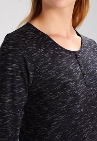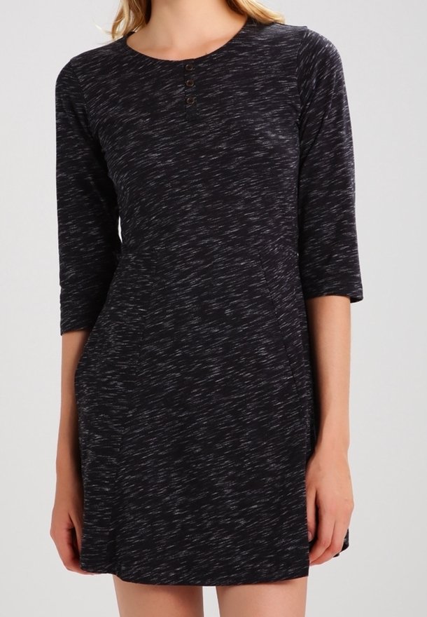 Robe noire avec un motif texturé, manches trois-quarts et col arrondi. Comprend trois boutons décoratifs au niveau du col.