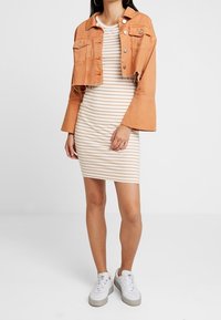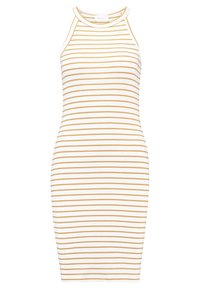 Robe blanche côtelée avec de fines rayures horizontales orange, dotée d'un col halter et d'une coupe ajustée, appropriée pour un usage décontracté.
