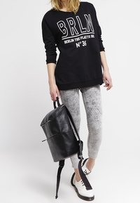 Sweat-shirt noir avec texte imprimé blanc "BRLN THE PLACE TO BE" et "N°36." Présente une coupe décontractée, des manches longues et des poignets côtelés.