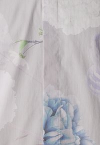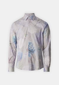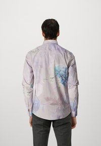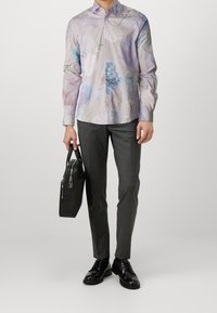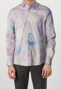 Homme portant une chemise à manches longues boutonnée avec un motif floral pastel en bleu et violet, assortie à un pantalon gris foncé.