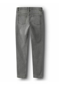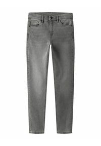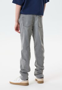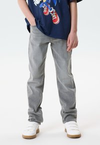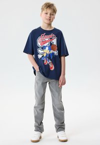 Garçon aux cheveux blonds courts portant un t-shirt graphique bleu Sonic the Hedgehog, un jean gris et des baskets blanches sur un fond blanc.