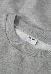 Sweatshirt gris à manches longues, col rond, avec des poignets et un ourlet côtelés. Fabriqué en tissu doux, affichant un design minimaliste.