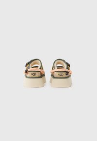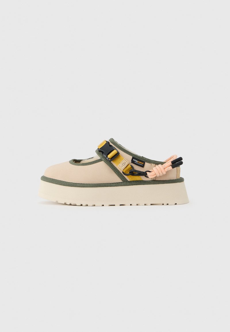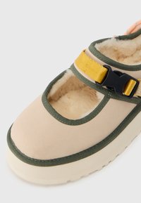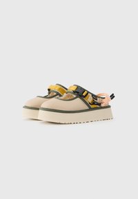 Sandale plateforme chunky beige et verte avec des brides réglables jaunes et noires, en tissu texturé, avec une semelle en caoutchouc.