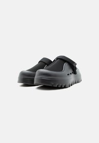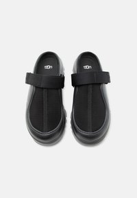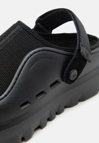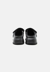 Sabot noir à enfiler avec semelle épaisse à crampons, dessus en mesh et bride réglable sur le cou-de-pied avec détail bouton.