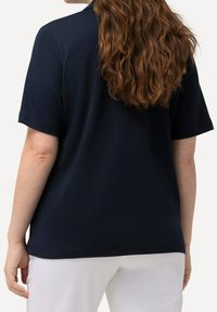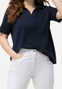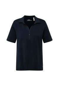 Polo bleu marine à manches courtes, patte de boutonnage à trois boutons et fente latérale. Fabriqué en matière douce, avec un petit logo au bas.