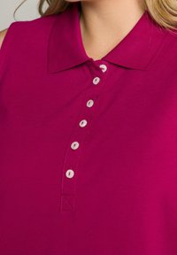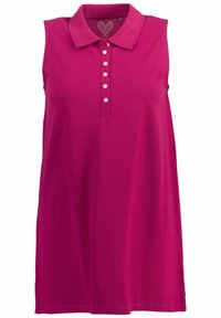 Polo sans manches magenta avec six boutons blancs porté par une personne aux longs cheveux blonds, associé à un pantalon noir.