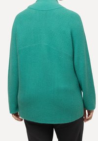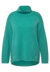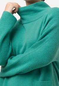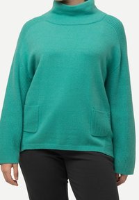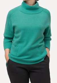 Pull en maille vert sarcelle à manches longues avec col roulé et deux poches avant, porté avec un pantalon noir, visible des épaules aux hanches.