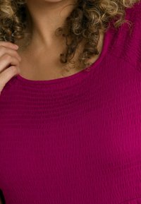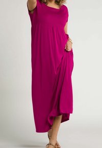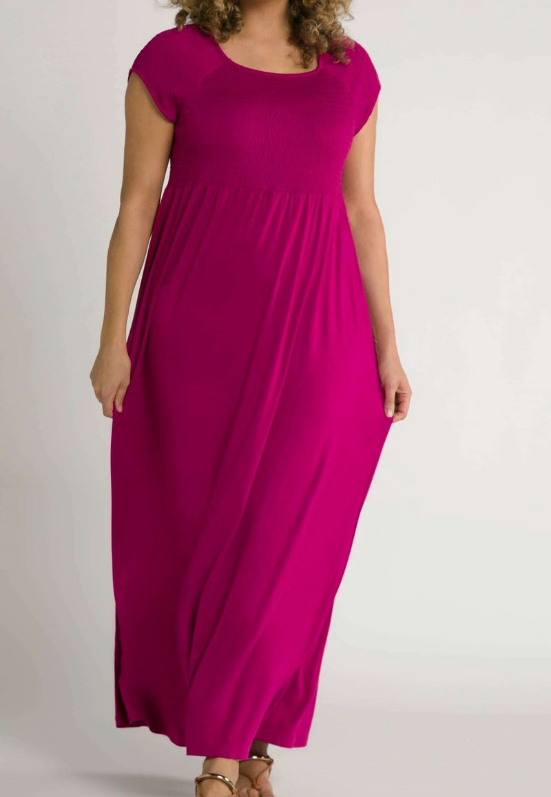 Robe maxi fuchsia avec manches courtes, corsage froncé, jupe fluide, tissu doux et fentes latérales, portée avec des sandales beiges.