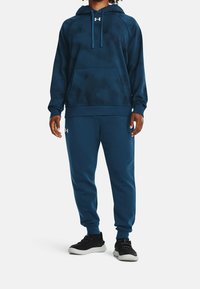 Personne portant un sweat à capuche bleu foncé texturé avec une poche à l'avant et un pantalon bleu assorti, debout avec les bras détendus le long du corps.