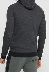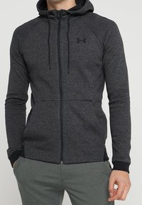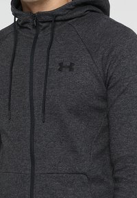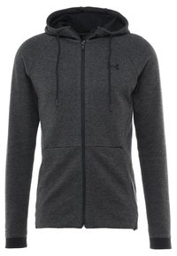 Sweat à capuche zippé gris foncé en tissu doux, avec capuche à cordon, manches raglan et petit logo sur la poitrine.