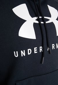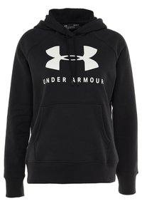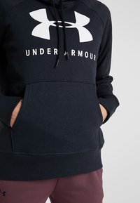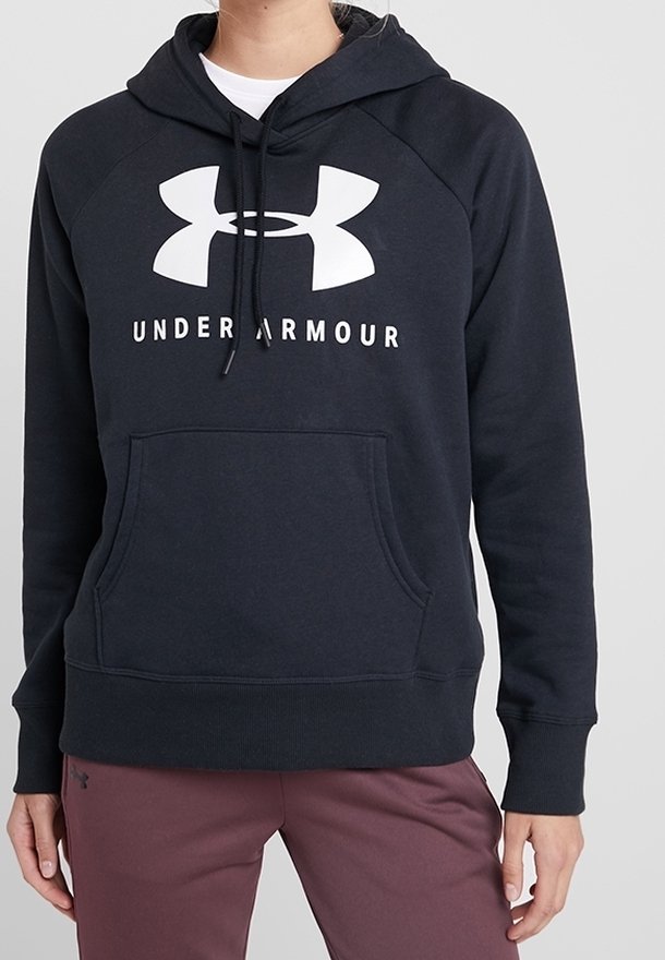 Sweat à capuche noir Under Armour avec grand logo blanc et texte, porté par une personne en pantalon bordeaux avec les mains détendues le long du corps.