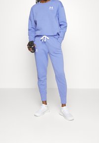 Sweatshirt violet en tissu doux, avec un col rond, des manches longues, et un logo Under Armour blanc sur la poitrine et la jambe gauche.